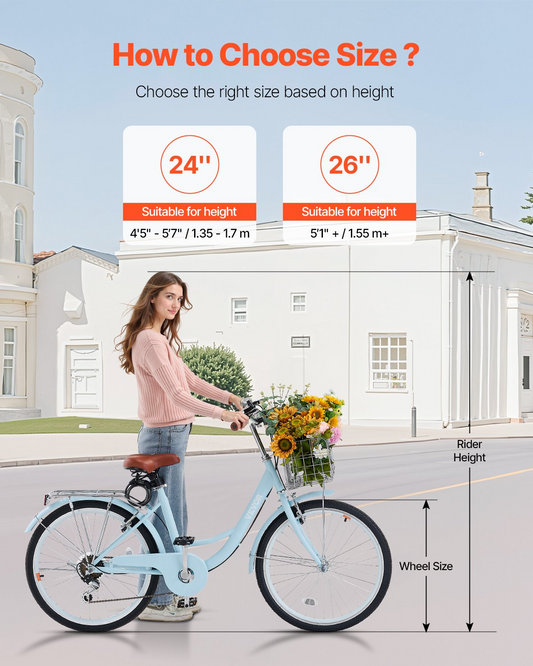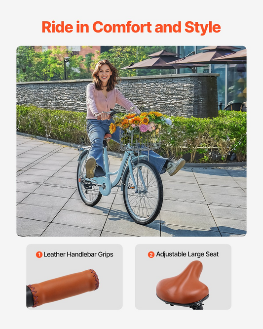 24-Inch Cruiser Bike 7-Speed Light Blue Beach Cruiser Bike with Basket