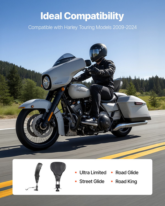 Adjustable Motorcycle Backrest Sissy Bar, Fit Harley Touring Models 2009-2024 with One-piece Slotted Seat, Street Glide, Road Glide, and Road King, Detachable Rider Backrest for Motorcycles, Black