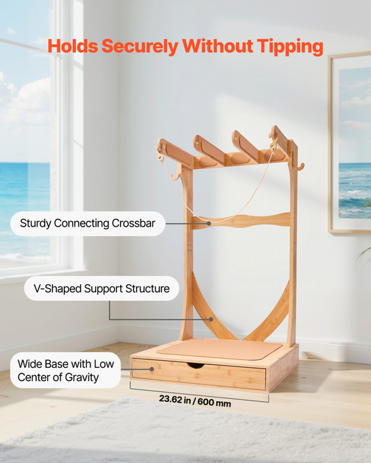 VEVOR Vertical Surfboard Stand, 3 Tiers Wooden Surfboard Rack for Storage and Display, Freestanding Board Stand Organizer with Hanging Hooks & Cork Padding, for Wakeboards, Snowboards, Kiteboards