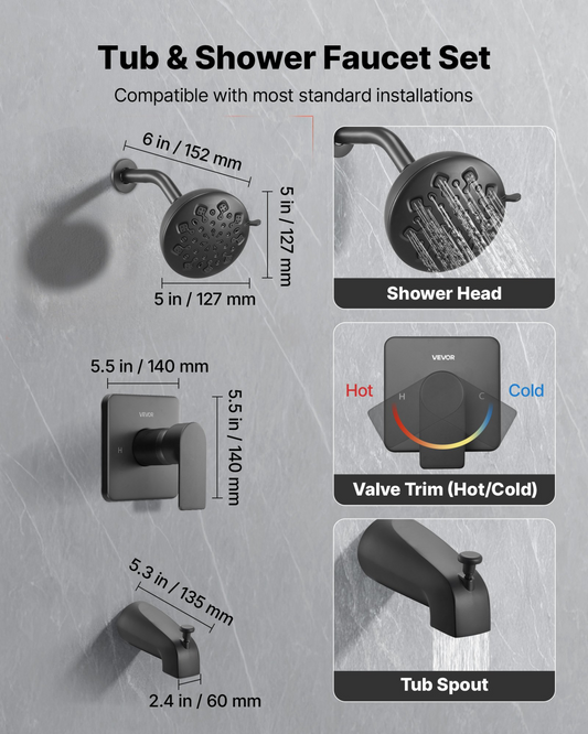 VEVOR Tub and Shower Faucet Set, 5-Inch Rainfall Shower Head and Bathtub Spout, Complete Single-Handle Tub Trim Kit with Brass Pressure Balancing Valve, 8-Setting Adjustable Spray Modes, Matte Black
