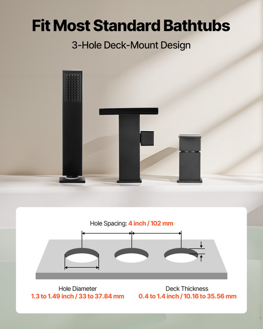 VEVOR Roman Tub Faucet, 3 Hole Waterfall Bathtub Faucet, Roman Bathtub Faucets Set with Shower Head & 1 Handle, Deck Mount Bath Tub Faucets Set for Pet Washing, Baby Care, Adult Bathing, Matte Black