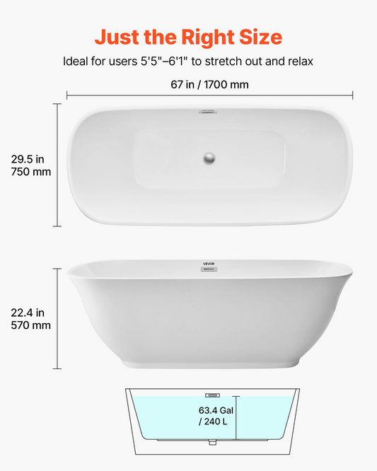 VEVOR Acrylic Freestanding Bathtub, 67 Inch Contemporary Soaking White Tub with Polished Chrome Overflow and Drain, Elegant Oval Shape Stand Alone Soaker Tub for Modern Bathroom or Remodel Projects