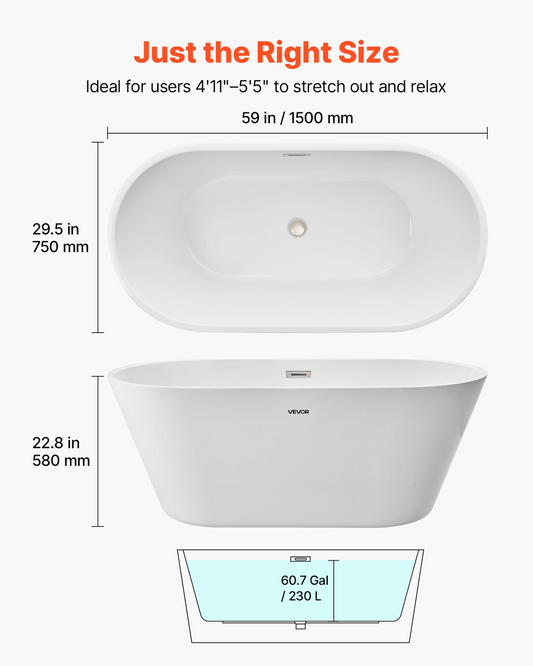 VEVOR Acrylic Freestanding Bathtub, 59 Inch Contemporary Soaking White Tub with Brushed Nickel Overflow and Drain, Elegant Oval Shape Stand Alone Soaker Tub for Modern Bathroom or Remodel Projects