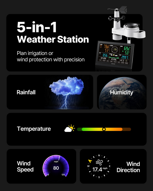 VEVOR 5-in-1 Wi-Fi Weather Station, 7.5-Inch VA Display, Wireless Solar Powered Outdoor Sensor, Rain Gauge, Indoor Outdoor for Weather Forecast, Wind Speed Direction, Temperature, Humidity, Rainfall