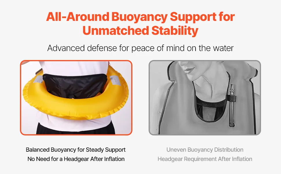 Experience complete, all-around buoyancy support that wraps securely around your body, minimizing the risk of the device slipping off during use. Our manual inflatable belt pack provides even buoyancy distribution, bringing superior security compared to non-surround models.