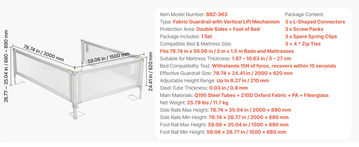 - Fits Most Beds: Height adjusts up to 8.27 in / 210 mm and fits bed side up to 78.74 x 59.06 in / 2.0 x 1.5 m. Compatible with mattress thicknesses from 1.97–10.63 in / 5–27 cm. Works with solid-wood frames, kids’ beds, platform/flat bases, mattresses, and other beds