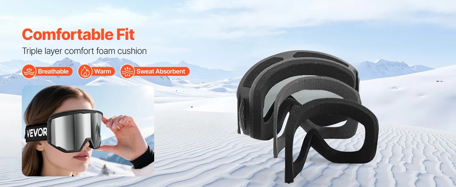 Soft triple-layer foam of the snowboard goggles gently contours to your face, absorbing shock and blocking cold air. The breathable, moisture-wicking design keeps you warm, sweat-free, and comfortable for all-day skiing.