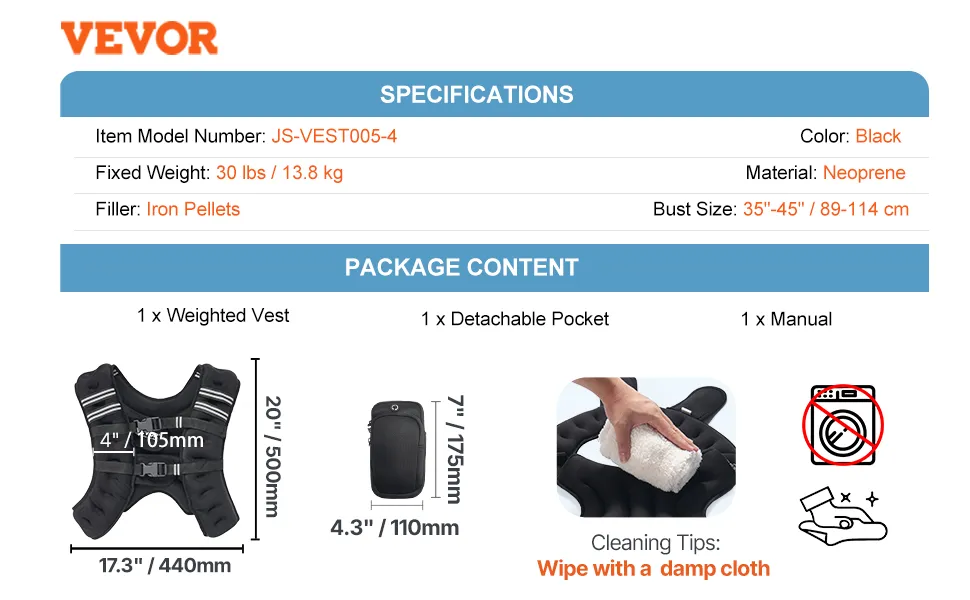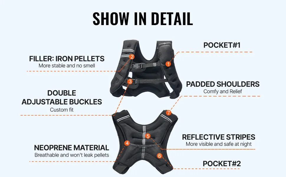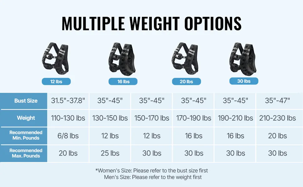 • Personalized Fit: The double adjustable buckles cater to bust sizes ranging from 35" to 45" (89-114 cm), ensuring a perfect fit for all body types. This customization feature ensures that the weighted vest stays securely in place, providing support and stability during any activity.