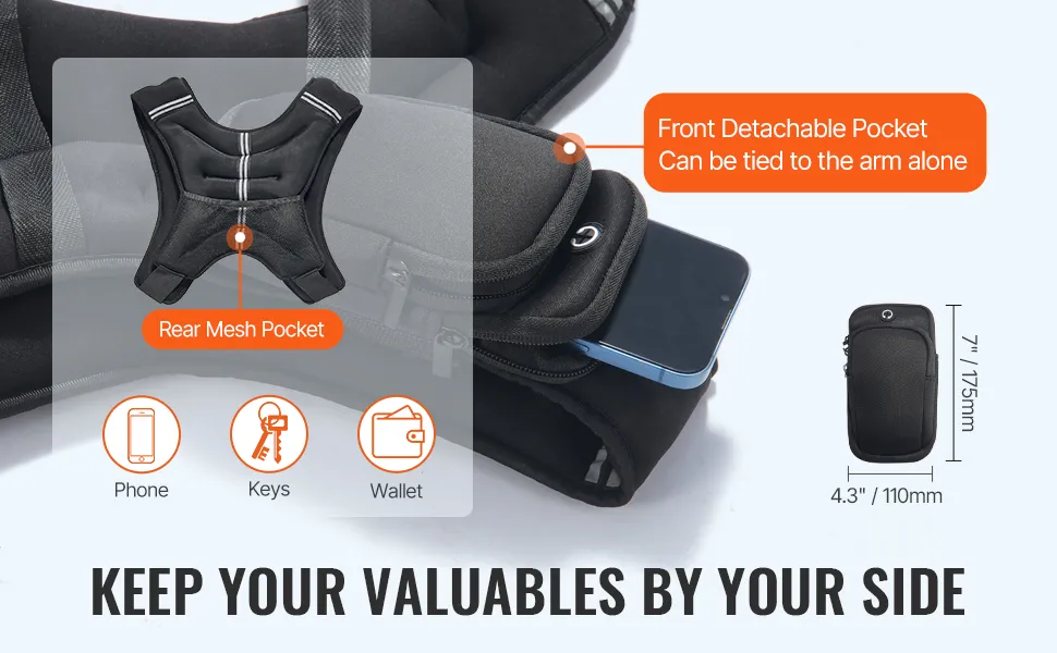 • Dual Storage Pockets: Featuring a front detachable pocket that can be conveniently tied to your arm, and a rear mesh pocket, our weighted vest offers ample storage options. Keep your valuables like phone, keys, and wallet safe.