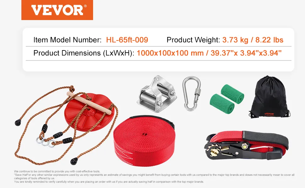 VEVOR Zipline Kit for Kids and Adult, 65 ft Zip Line Kits Up to 500 lb, Backyard Outdoor Quick Setup Zipline, Playground Entertainment with Zipline, Nylon Safety Harness, Seat, and Handlebar