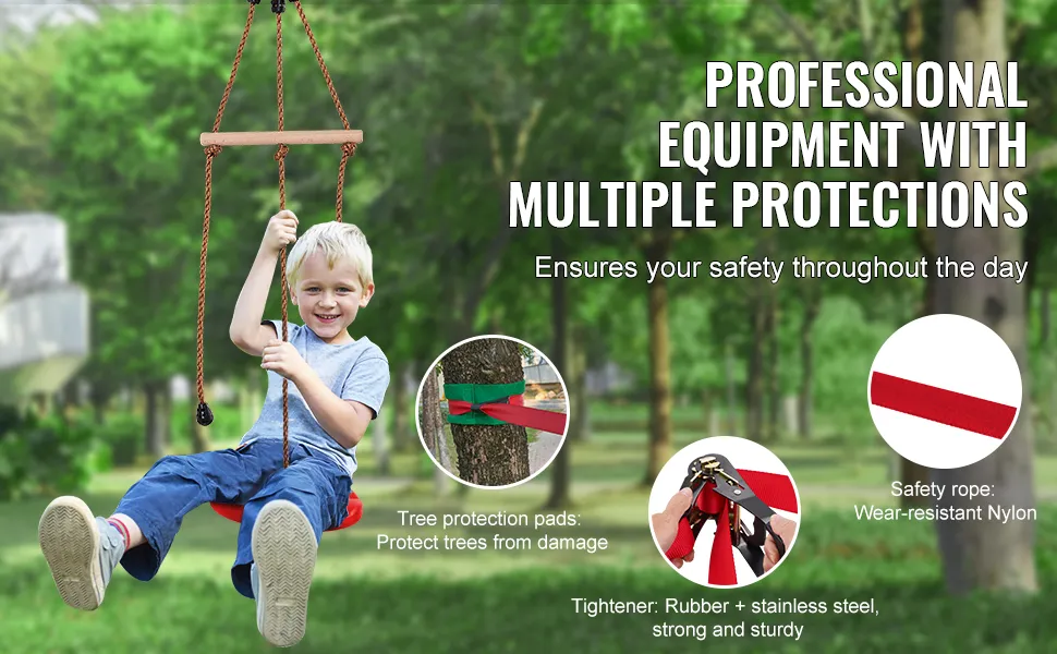 Dual protection with seat safety belts and rope safety harnesses, significantly reducing the risk of injuries. Equipped with two tree protectors to prevent damage to trees, also serving as slack line protectors. The tensioner easily tightens and secures the straps with simple operation.